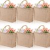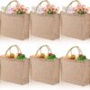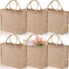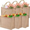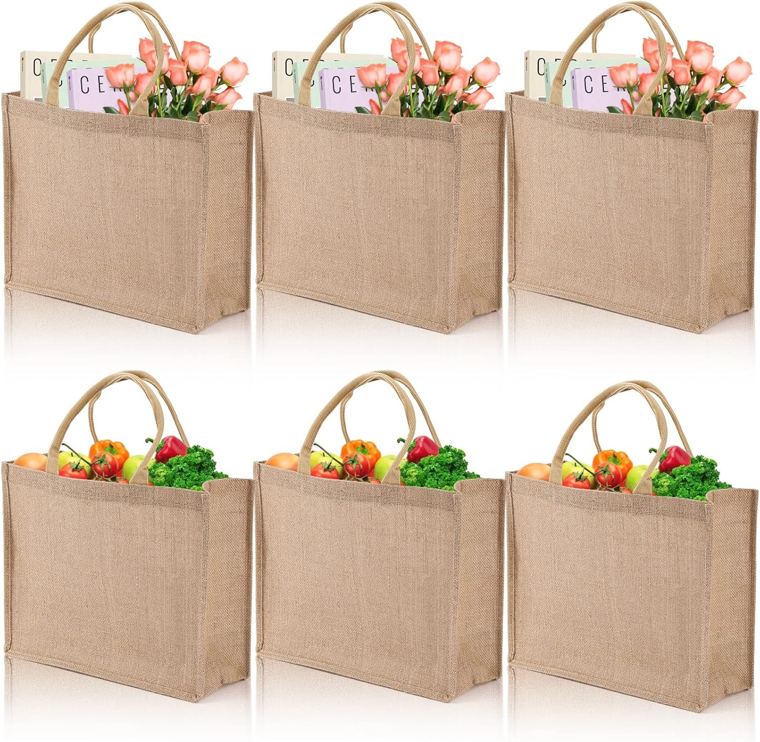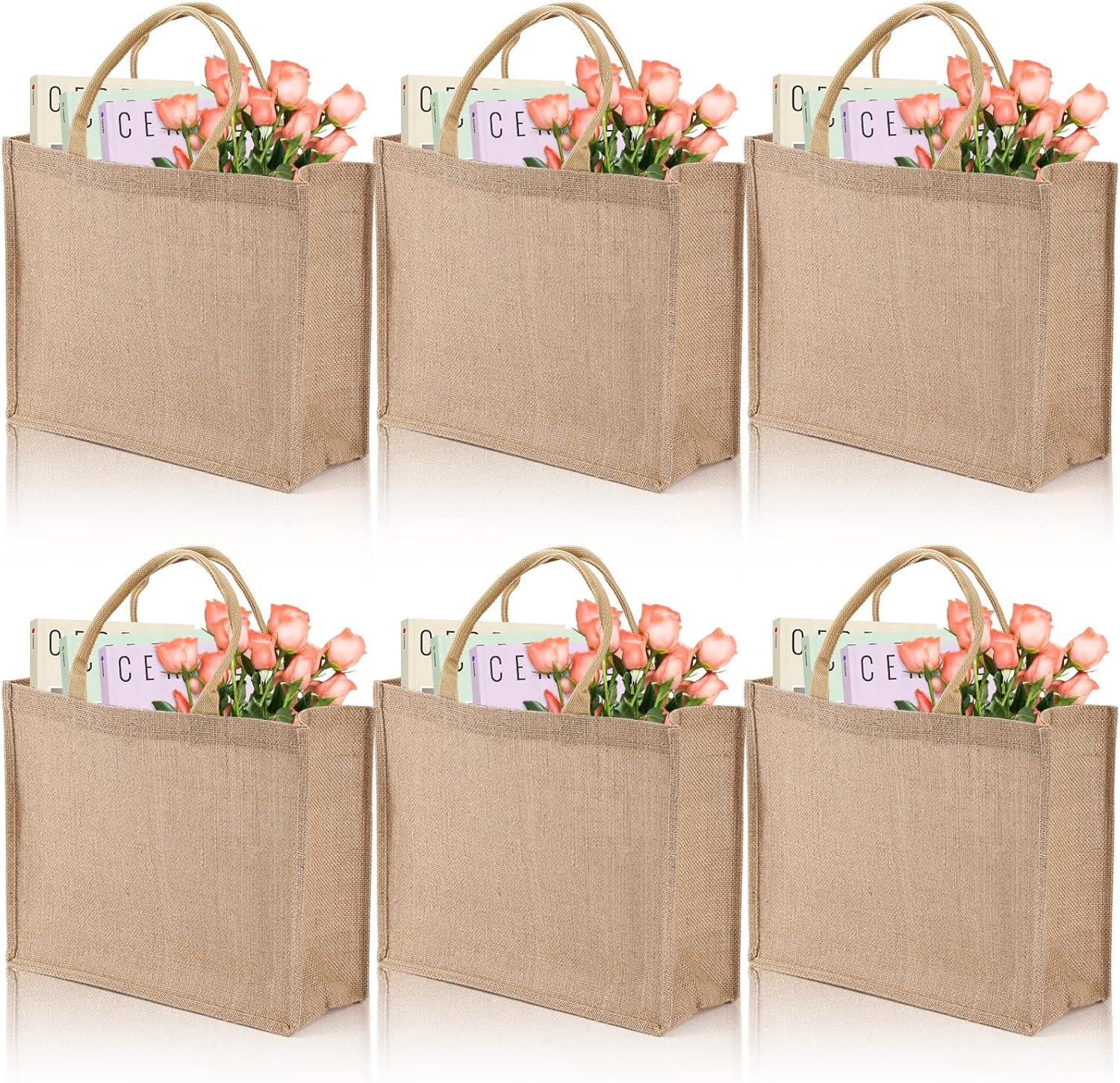 6 Pack Large Jute Burlap Tote Bag, Jute Beach Bag with Laminated Interior, Burlap Gift Tote with Handle, Reusable Lined Market Grocery Shopping Bag for DIY, Wedding,15.4”x12.2”x5.9”