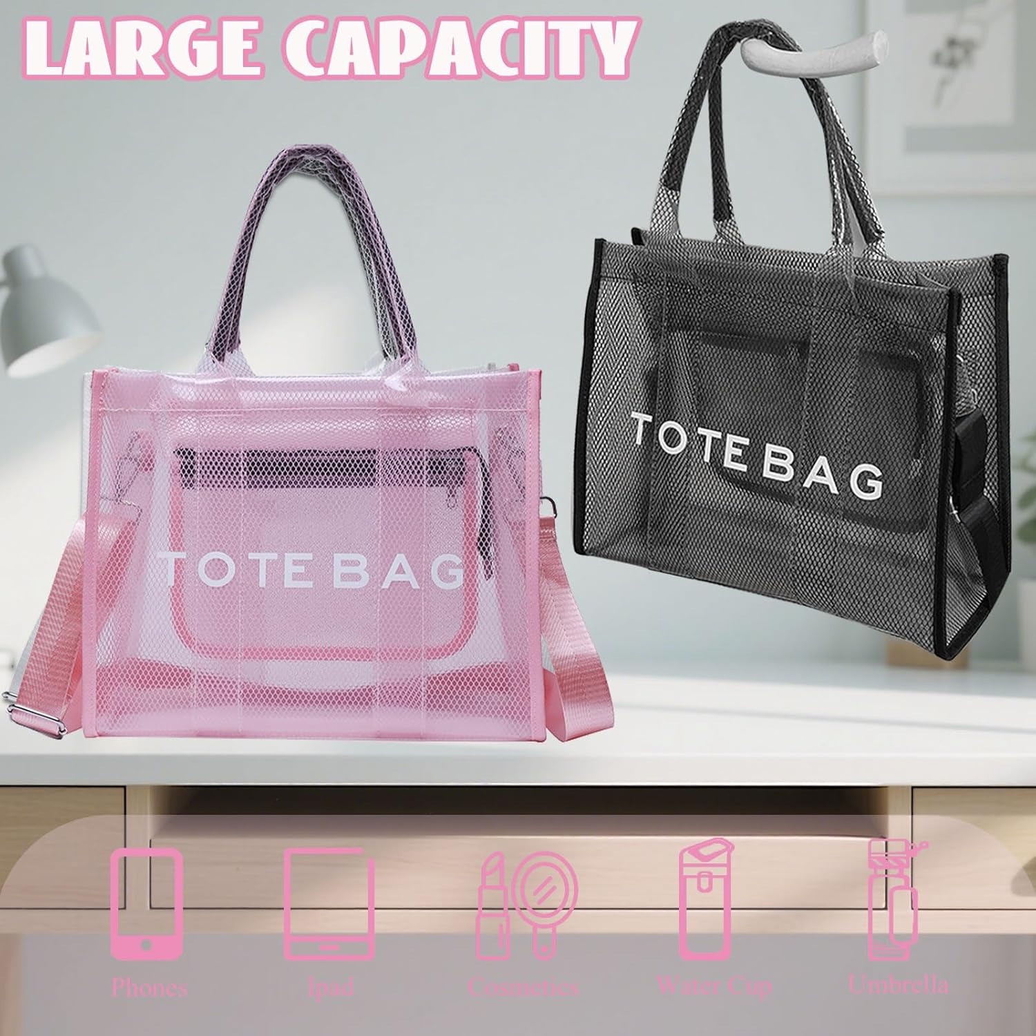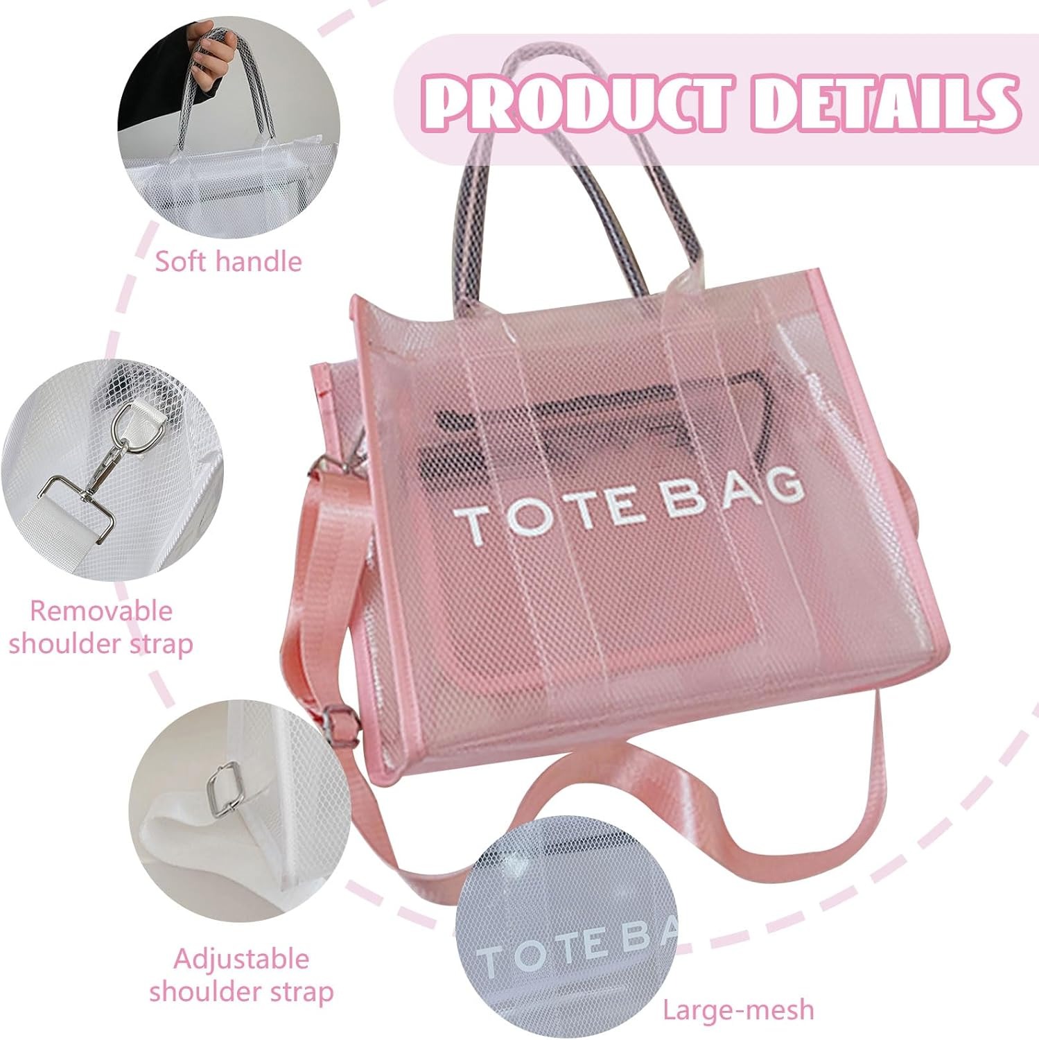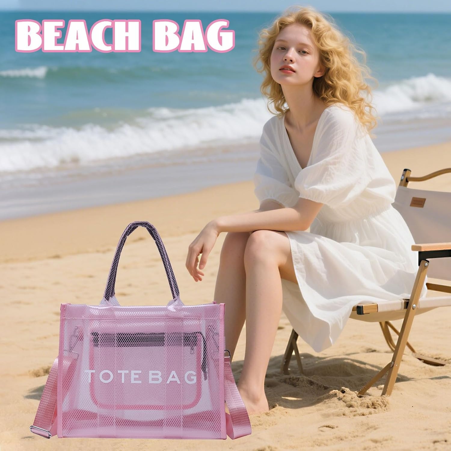 Clear Tote Bag for Women, Large Mesh Beach Bag, PVC Clear Crossbody Bags with Zipper, Stadium Bag for Travel Sports