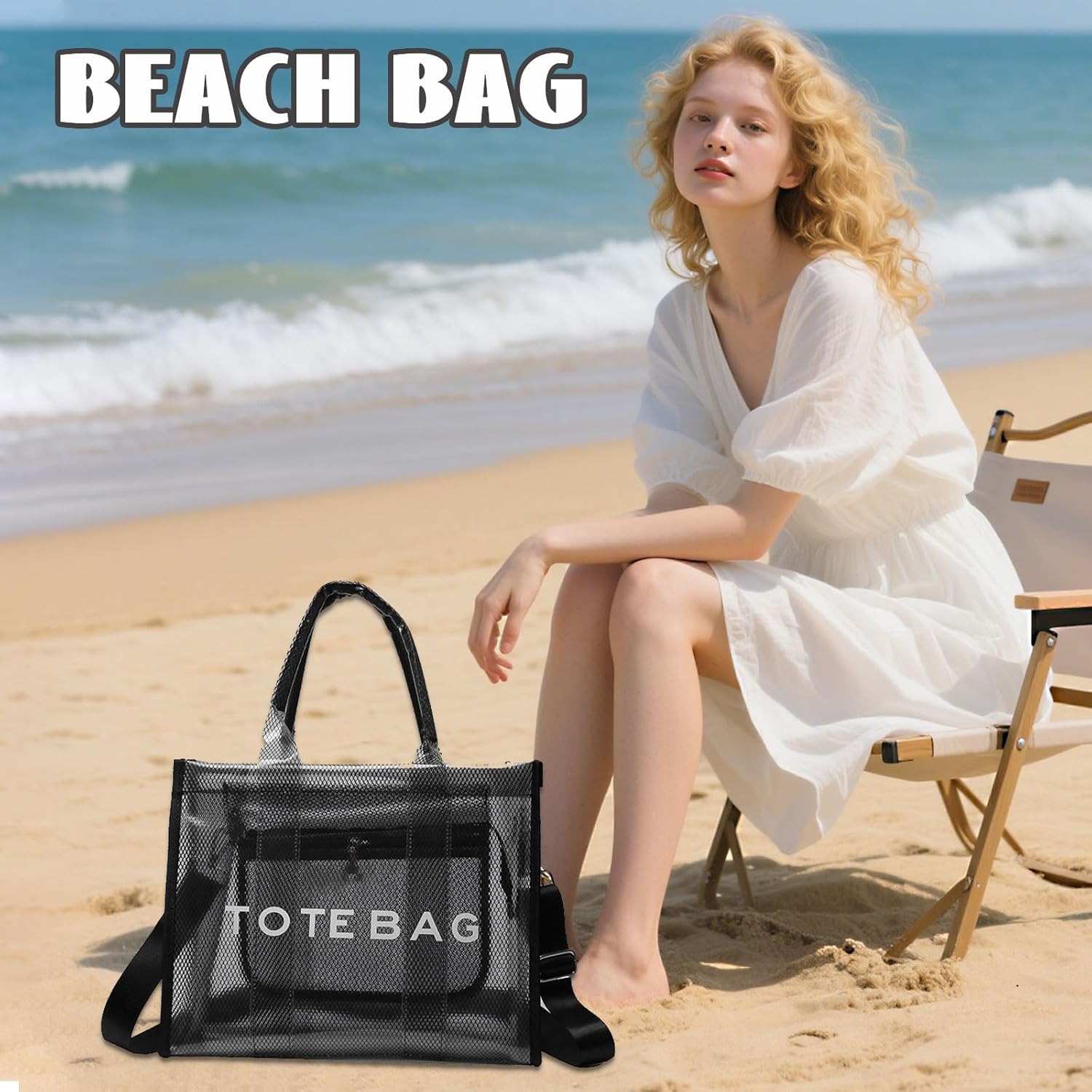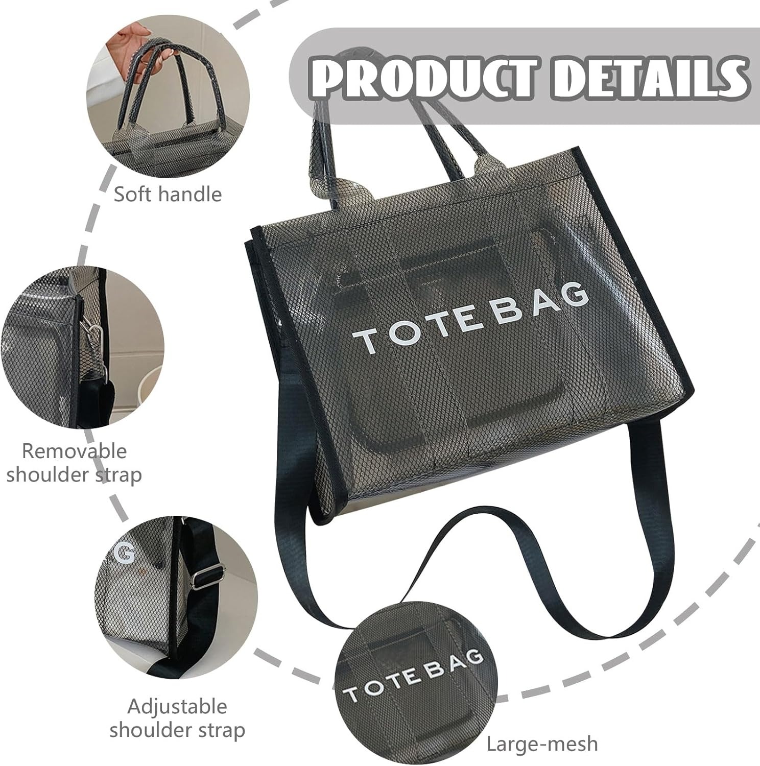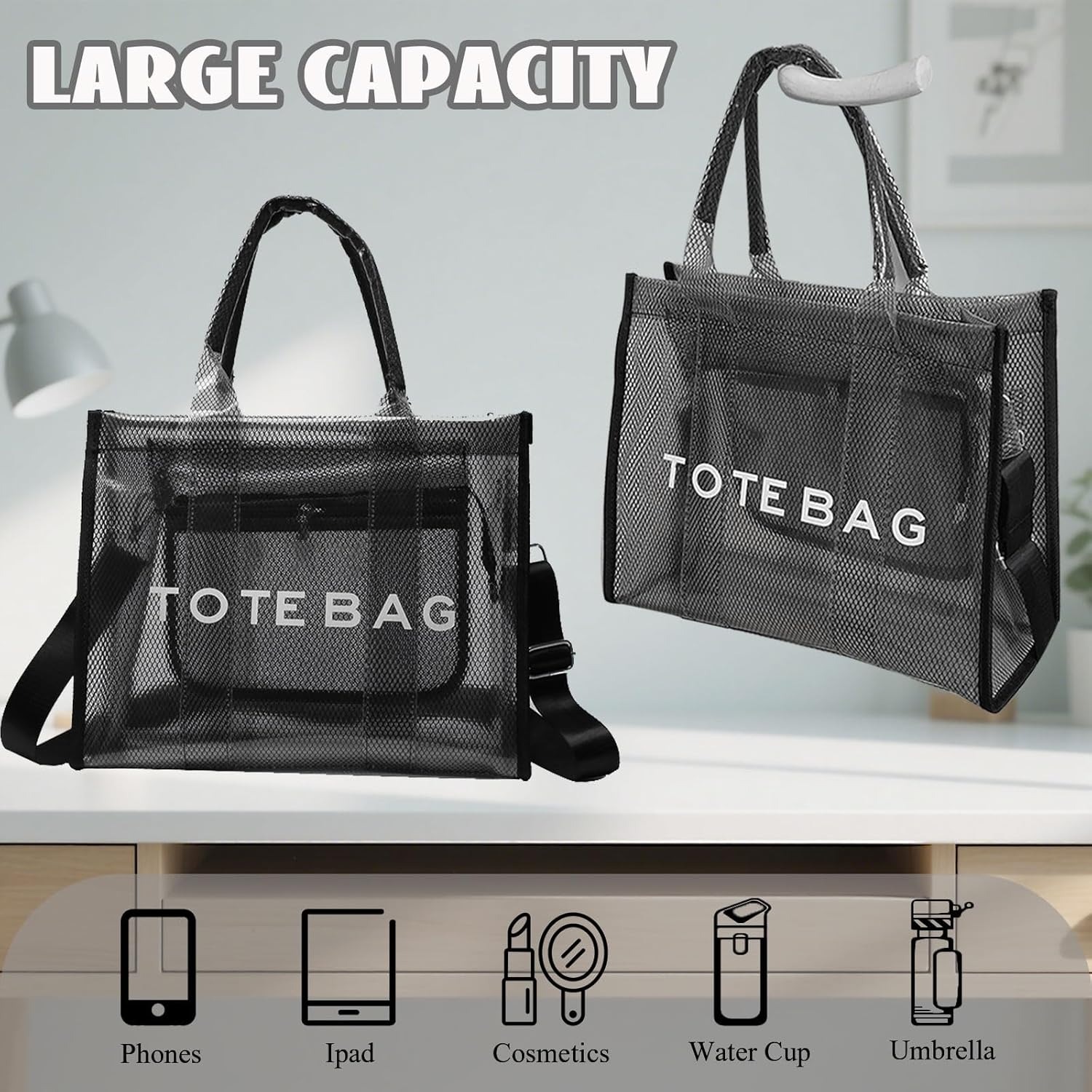 Clear Tote Bag for Women, Large Mesh Beach Bag, PVC Clear Crossbody Bags with Zipper, Stadium Bag for Travel Sports