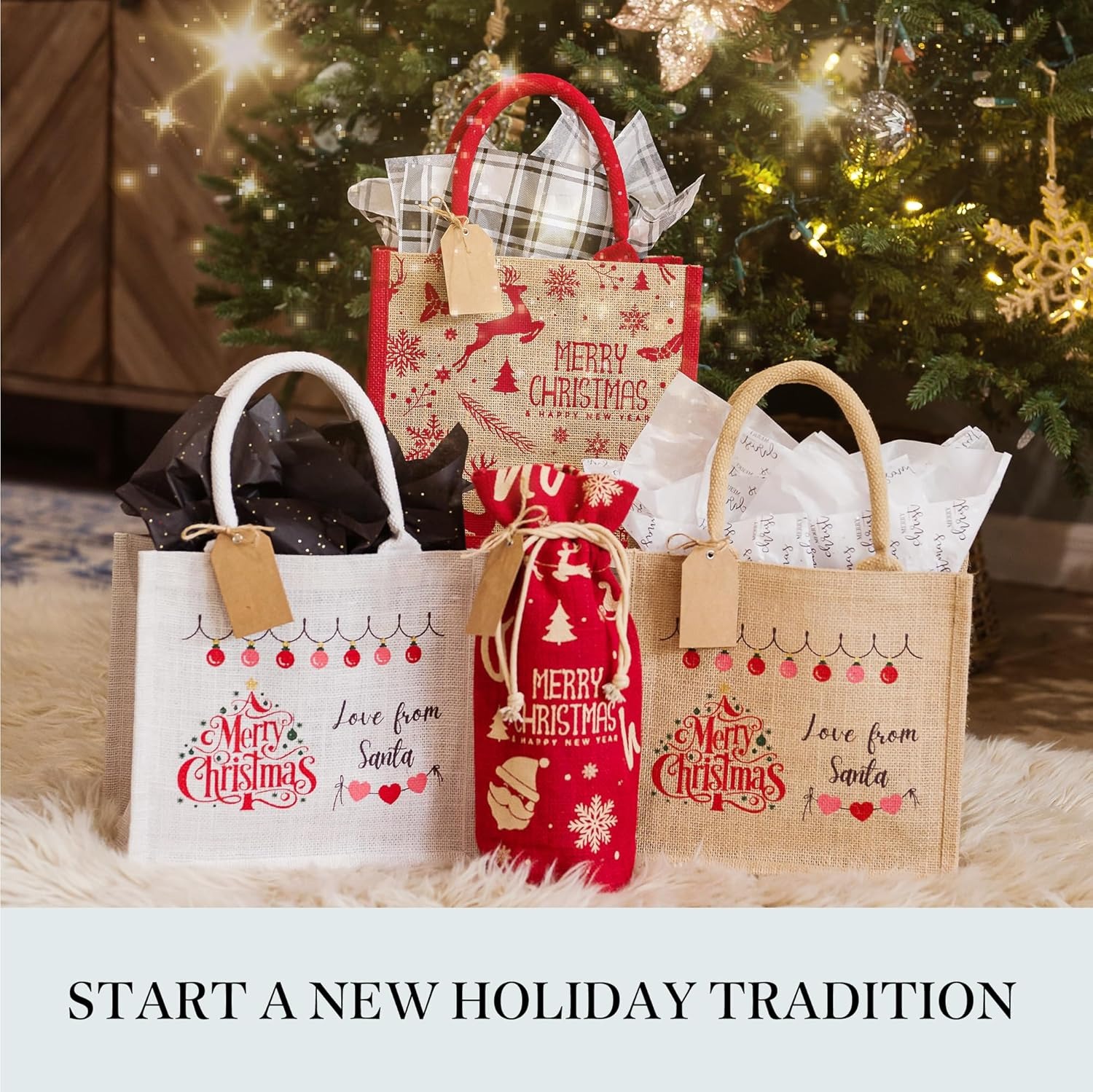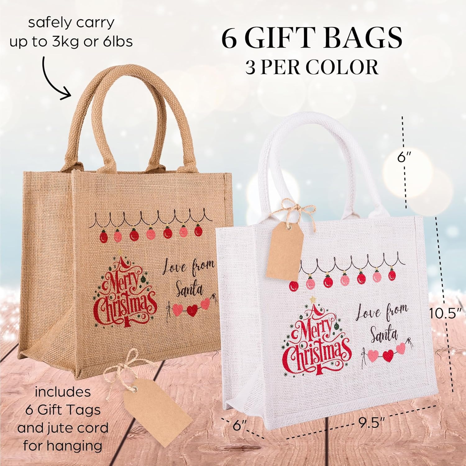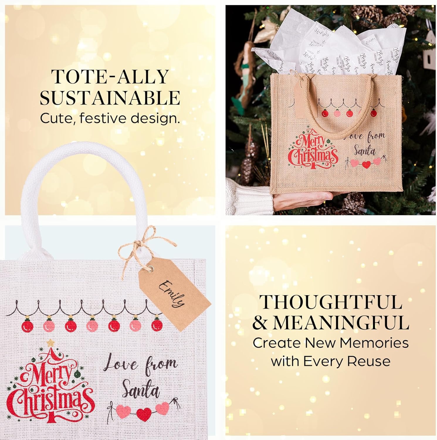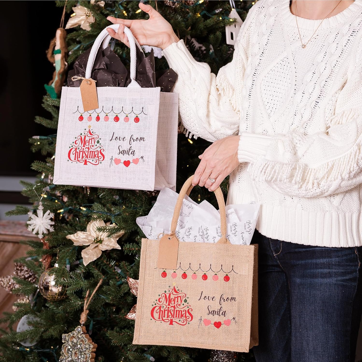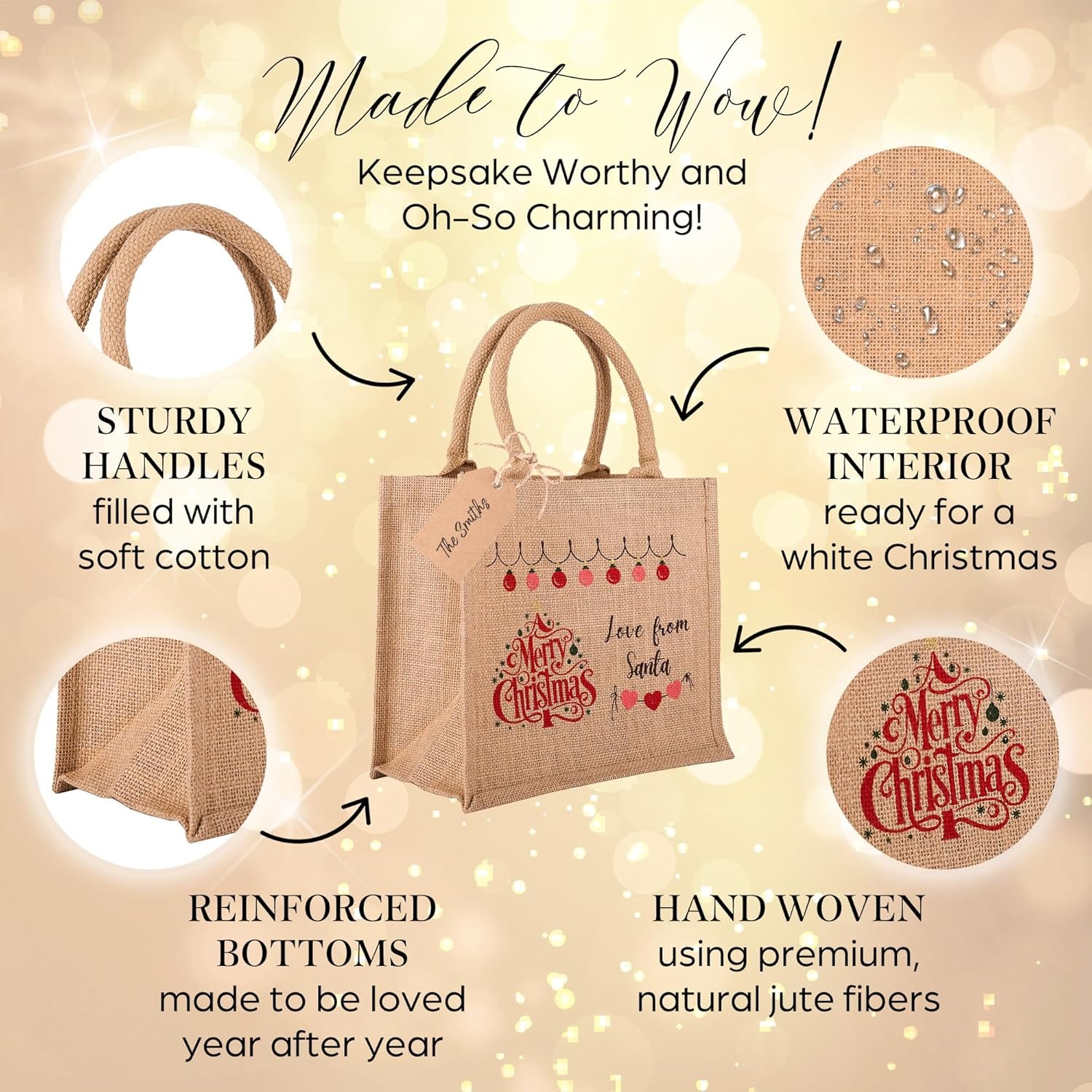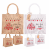 Eco-friendly Christmas Waterproof Jute Blank Water Resistant Grocery Bags with Ribbon 15.35*6*12 Inch for Women Bridesmaid Gift Beach Shopping
