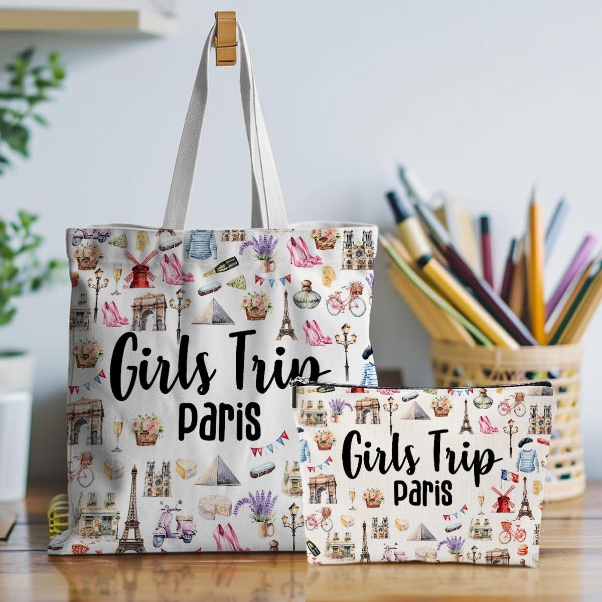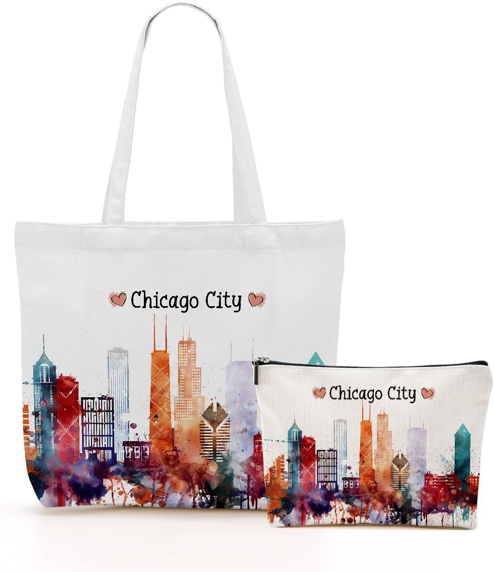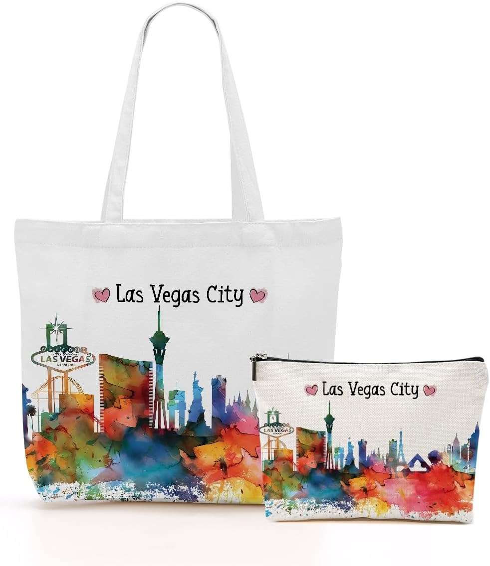 / jeilink Las Vegas New York Chicago Paris Canvas Tote Bag Makeup Bag Set for Work Shopping Travel Birthday Christmas