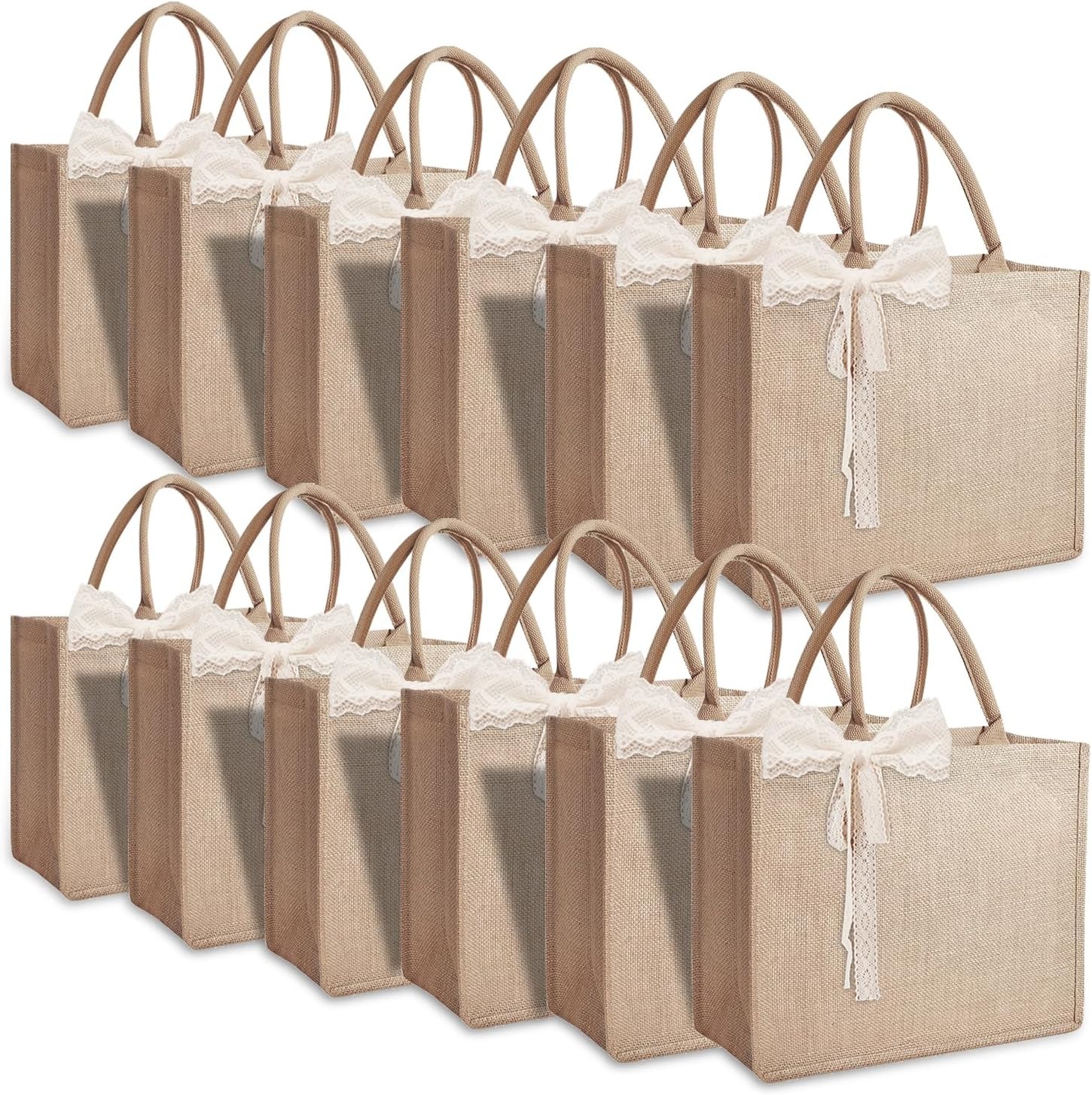 Reusable Waterproof Jute Blank Water Resistant Grocery Bags with Ribbon 15.35*6*12 Inch for Women Bridesmaid Gift Beach Shopping